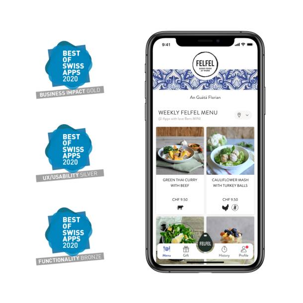 Die virtuelle Award Verleihung startete fulminant. In der Kategorie “Business Impact” durften wir als erstes gleich eine Goldmedaille entgegen nehmen. Ausgezeichnet wurde die FELFEL App, mit welcher Infos zu den FELFEL Wochenmenüs zugänglich gemacht, der Kühlschrank geöffnet und anderen Mitarbeitenden Geschenke geschickt werden können. Die App vereinfacht die Registration und das Onboarding neuer FELFEL Kund*innen, was sich positiv auf die Nutzungsintensität und dementsprechend das Business von FELFEL auswirkt.Die Laudatio, vorgetragen von Jurypräsident Christian Waha: