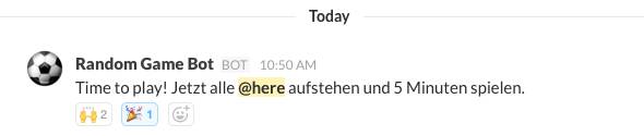 Wir haben einen Zufallsgenerator programmiert, der zweimal in der Woche einen Game-Alarm abspielt und gleichzeitig alle Mitarbeiter auf Slack auffordert zu spielen. Jeder im Office und auch die gerade anwesenden Kunden sind aufgefordert 5-10 Minuten zu spielen.
