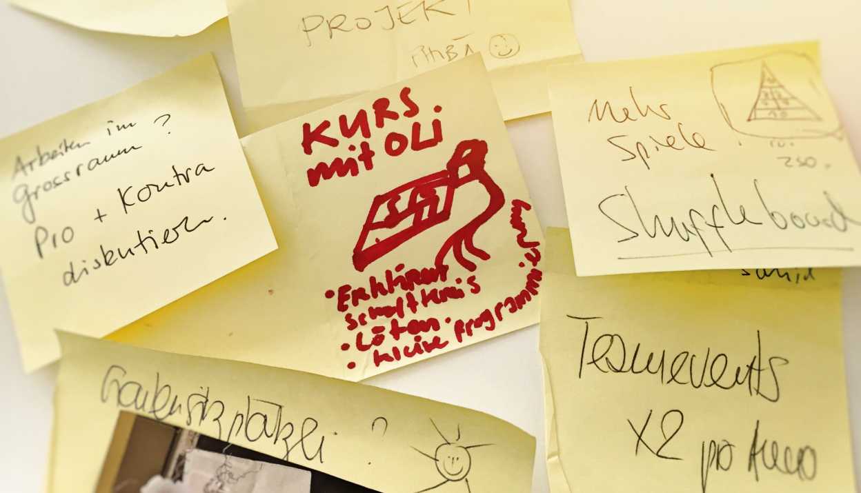 An einem zentralen Ort steht ein Topf, in welchen man beliebig viele Inputs in Form von beschriebenen Zetteln einwerfen kann.