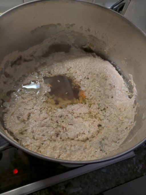 Man bringt 8 Liter Fond zum Kochen, fügt die feingehackte Mehlschwitze hinzu, rührt das Ganze mit dem Löffel oder dem Schneebesen glatt, bringt es unter beständigem Rühren zum Kochen und lässt hierauf an der Seite des Feuers langsam aber beständig weiter kochen.