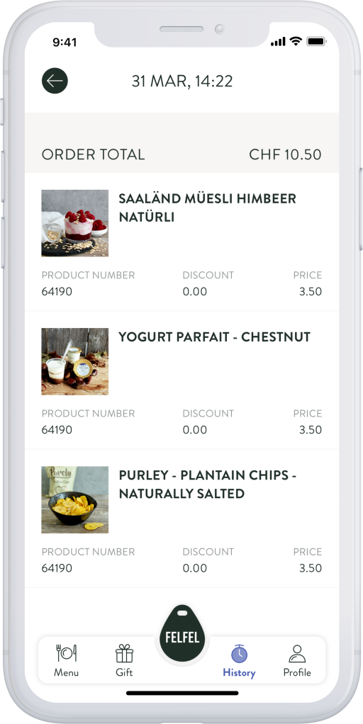 The app provides access to the interactive fridge that contains fresh and healthy meals at any time. Through the app employees can always keep an eye on all the meals that are currently available, their transactions and much more. The dishes are prepared and delivered by partner chefs from small family businesses on behalf of FELFEL.