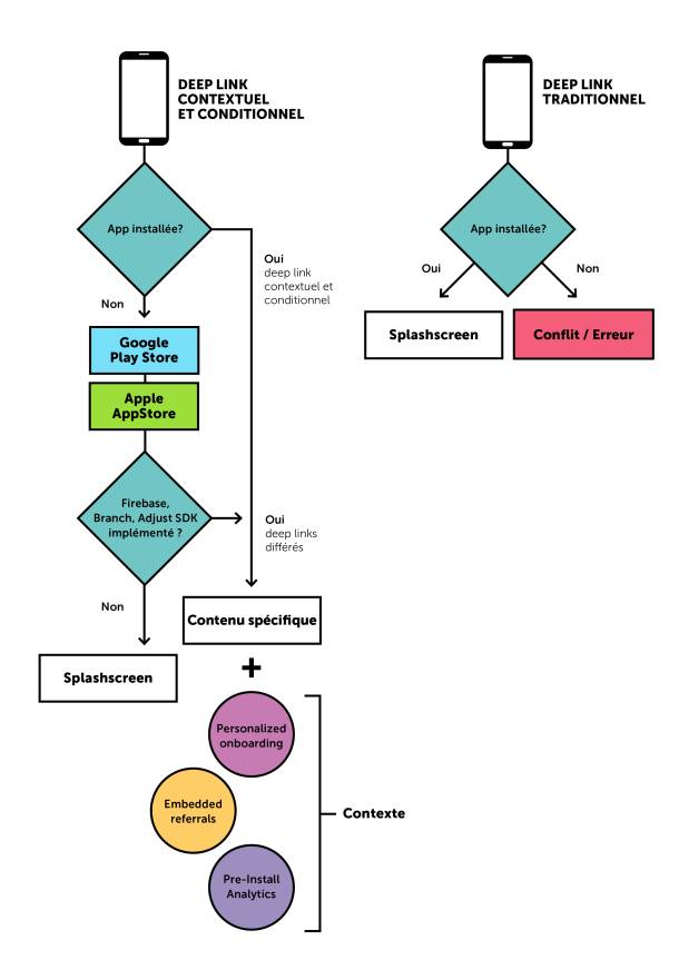 ##Deep links différés Mais que se passe-t-il si on veut rediriger l'utilisateur vers un certain contenu dans une app (par exemple ton-app://produit/SK001) et que l'utilisateur n'a pas installé l'application ? Avec les deep links traditionnels, l'information vers laquelle l'utilisateur doit être redirigé est perdue après l'installation de l'application. Les deep links différés, quant à eux, conservent ces informations pendant l'installation de l'app afin de rediriger l'utilisateur vers l'emplacement correct après le démarrage de l'app.Les services tels que "Branch", "Adjust" et "Firebase" offrent la possibilité, via leur SDK (Software Development Kit), de rediriger l'utilisateur directement vers le contenu souhaité, après l'installation et le premier démarrage de l’app. Avec l'intégration du SDK, l'avantage est que les informations de contenu du deep link différé ne sont pas perdues lorsque l'utilisateur est redirigé vers une app qui n’est pas installée, mais ceux-ci sont gardés en mémoire sur le service jusqu’au démarrage de l’app. C'est bien sûr la variante optimale dans de nombreux cas, mais cela nécessite l'utilisation d'un SDK tiers, ce qui ajoute une complexité et des coûts supplémentaires.De plus, des programmes de recommandations avec processus d’enregistrements peuvent également être mis en oeuvre à l’aide de deep links pour attirer de nouveaux utilisateurs. Par exemple, un lien unique peut être créé pour chaque utilisateur, qui est ensuite utilisé comme un deep link dynamique et reconnu par l'app du nouvel utilisateur. Ainsi, après vérification avec le back-end, cela permet d’offrir une récompense au nouvel utilisateur.