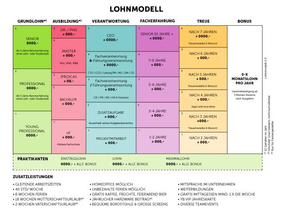 Au cours des derniers mois, j’ai réfléchi intensivement à notre modèle salarial. L’objectif était d’établir un modèle juste traitant tout le monde de la même manière, grâce auquel Apps with love ne doive plus mener de négociations salariales. Si les montants de tous les salaires étaient affichés sur le tableau noir demain, tous devraient encore avoir envie de travailler ensemble, sans que cela pose problème. J’ai tout d’abord pensé à l’égalité de salaire, mais celle-ci peut aussi démotiver. Le personnel se différencie au niveau de l’expérience, de la formation ou de la responsabilité. Bien qu’une transparence salariale soit possible avec ce modèle, l’essentiel d’un modèle salarial juste est que chacun connaisse les critères d’évaluation et les comprenne. Il ne s’agit pas de transparence salariale, mais de critères de rémunération équitables et transparents.