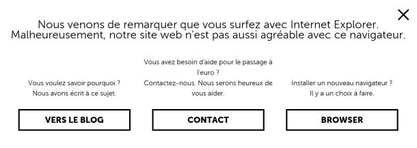 Tu as pu arriver sur ce blog de deux façons: soit tu l’as trouvé par un lien, dans des résultats de recherche, sur des réseaux sociaux ou autres, soit parce que tu as navigué sur notre site avec une version d’Internet Explorer (dans ce cas, désolé 🙈 ) et as vu la bannière suivante puis cliqué sur le lien vers le blog: