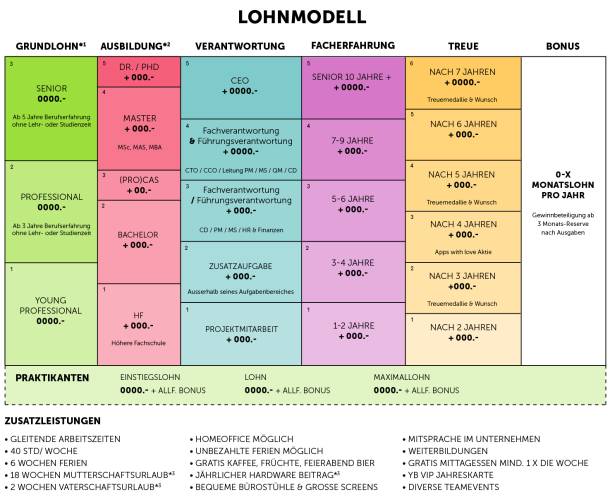 Même si nous n’affichons pas chaque salaire, le modèle s’applique à tous et chacun peut donc calculer le salaire approximatif de leurs collègues. Il est également possible d’estimer son salaire sur plusieurs années, le salaire évoluant au fil des ans.