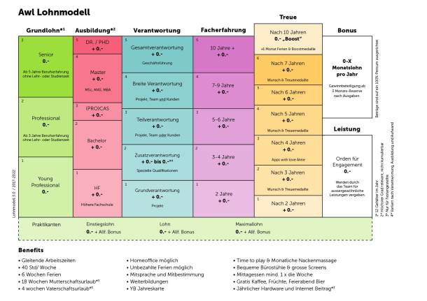 Auch wenn wir nicht jeden Lohn ans schwarze Brett hängen, das Modell ist für alle das selbe und jeder kann ausrechnen, wie die anderen Löhne etwa aussehen. Der eigene Lohn kann über Jahre hinaus eingeschätzt werden, da sich der Lohn Jahr für Jahr entwickelt.